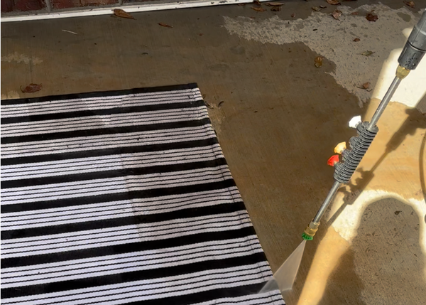 This works well with large rugs as well! Remove them from your house to avoid getting your house wet, and spray down your rugs with your high-pressure hose. I do recommend checking a corner of your rug first to make sure it can handle the power washing before you use the high-pressure spray on the entire thing. You don’t want to ruin your rugs!
