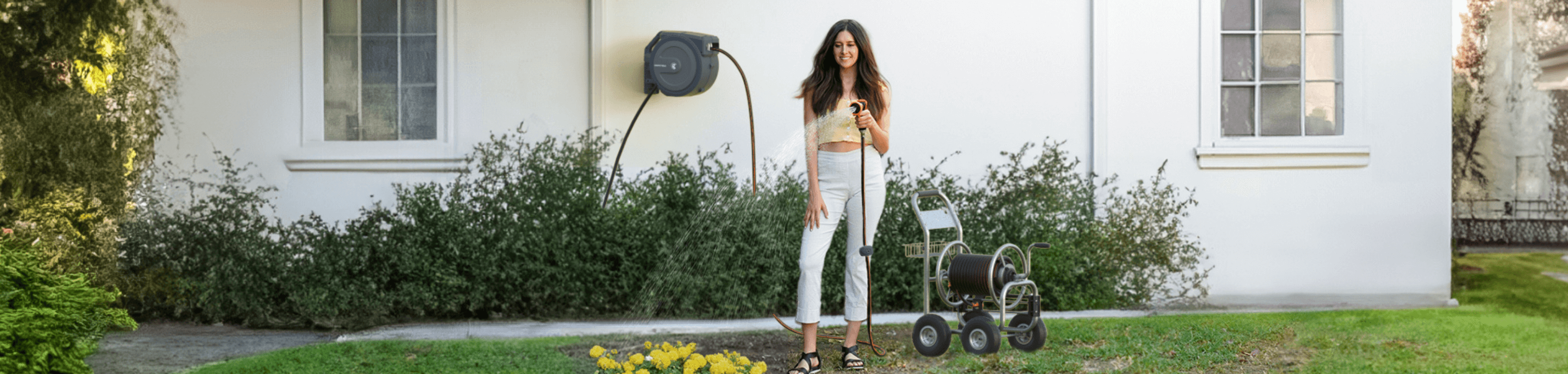 Wall-mounted retractable hose reels provide you with a one-stop watering service. Gently pull and ready to use, no tangles, and self-storage.