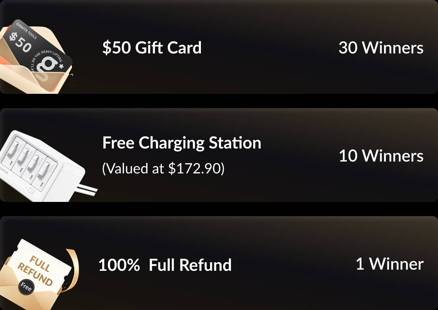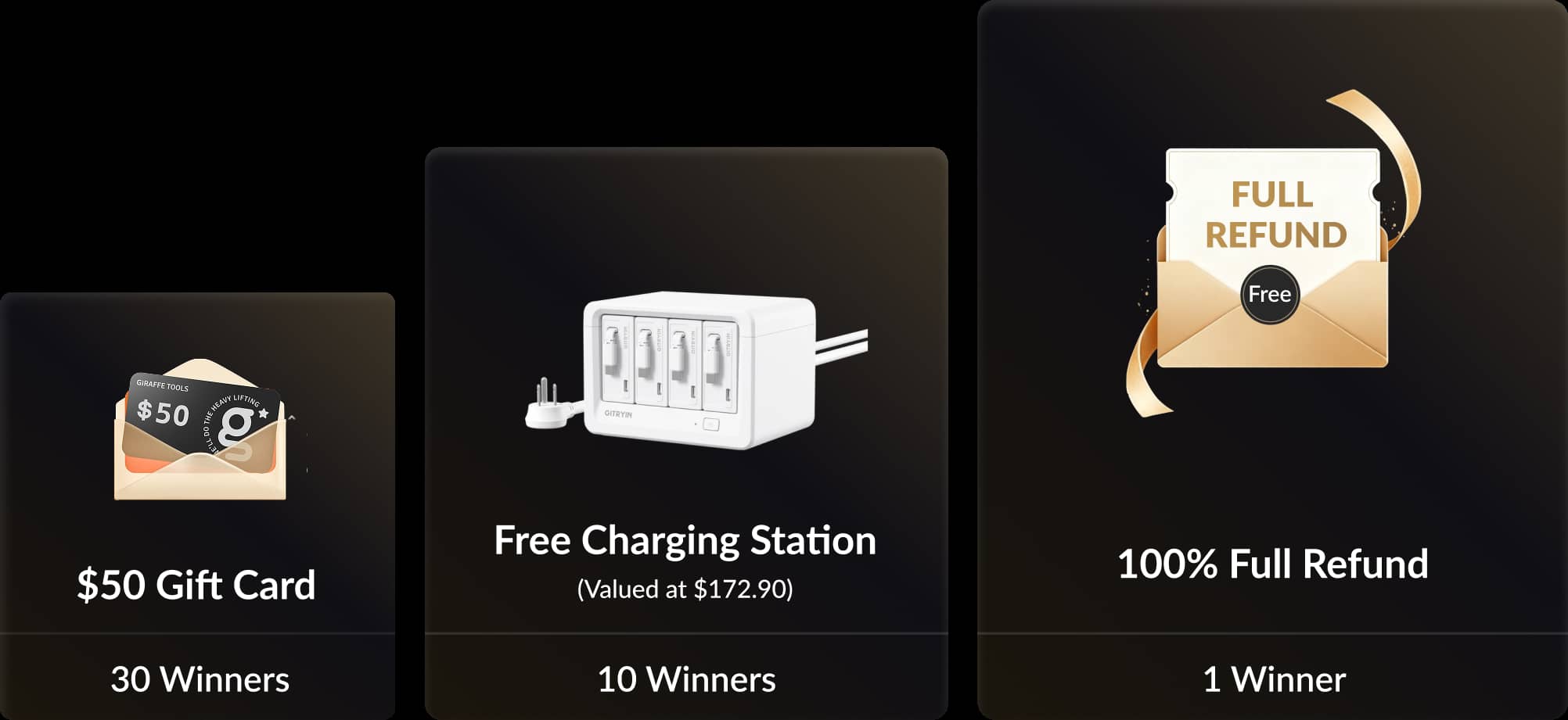 - Second Prize: Charging Station (worth $172.99) × 10 winners