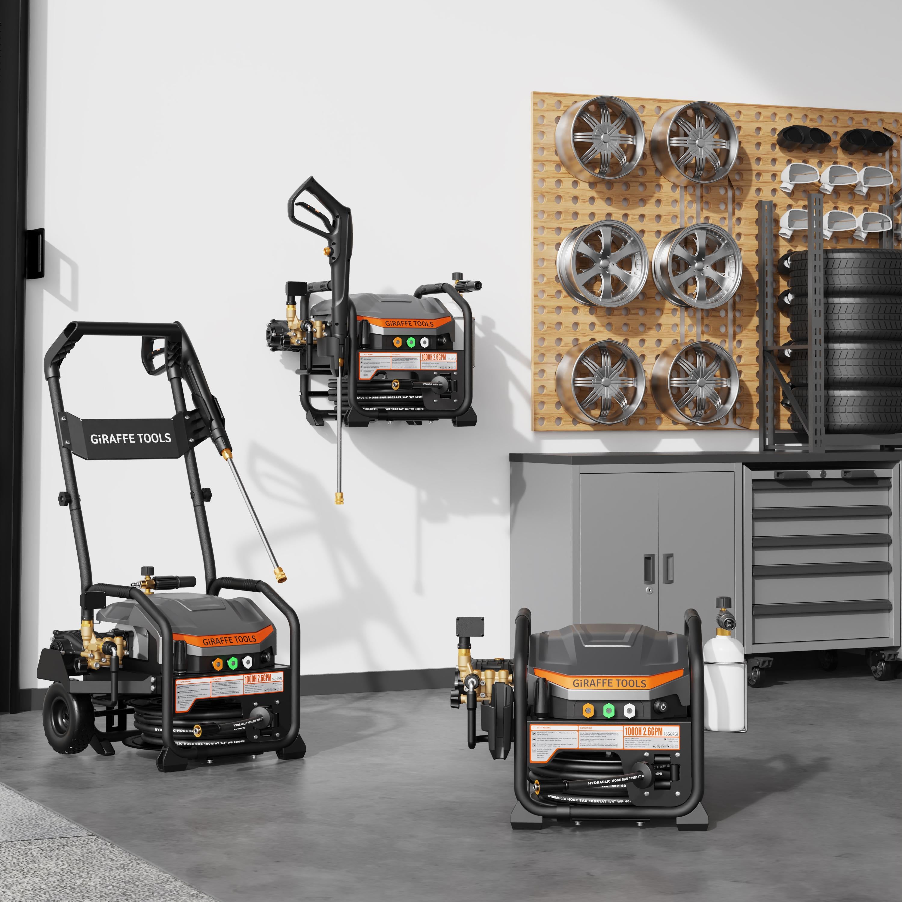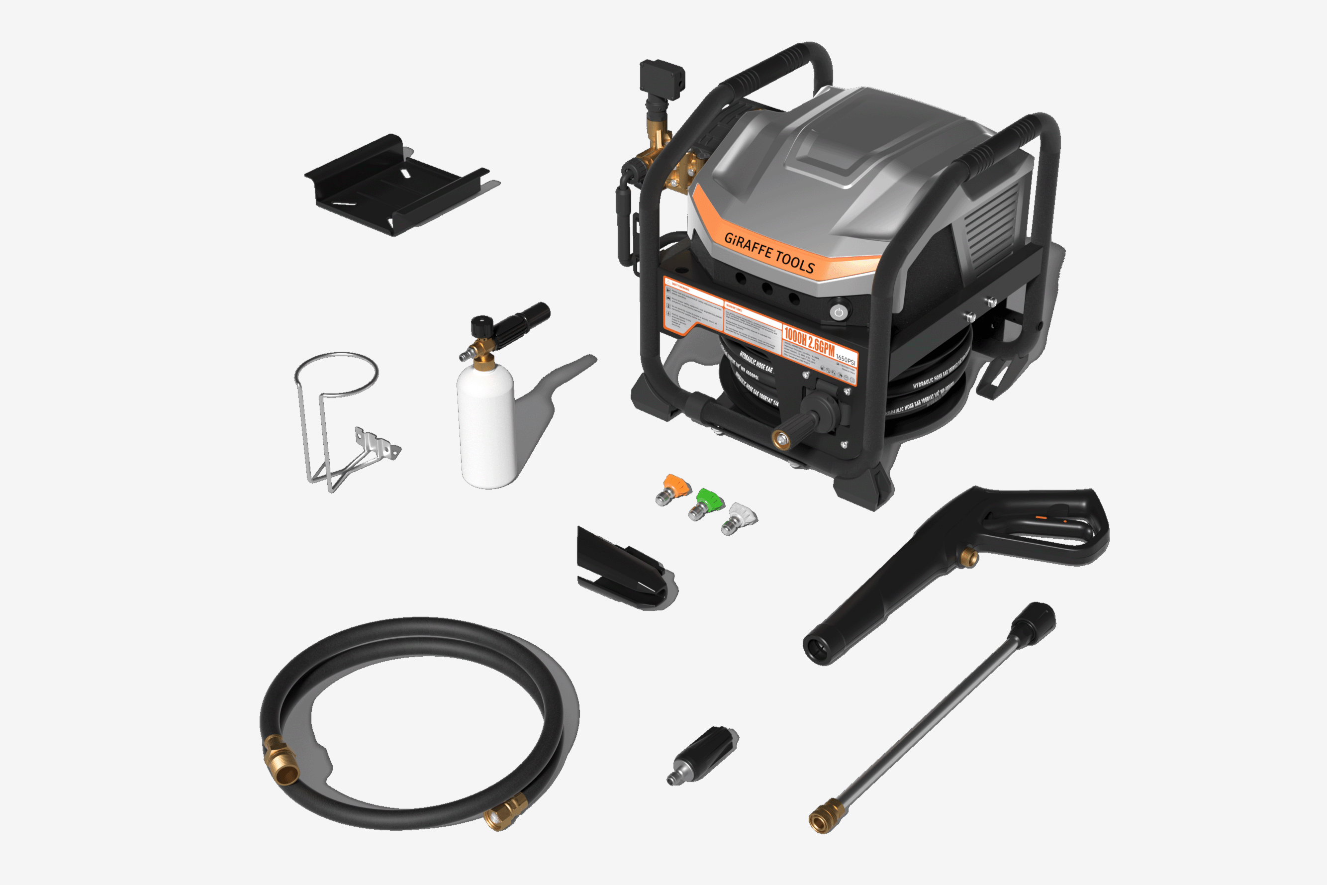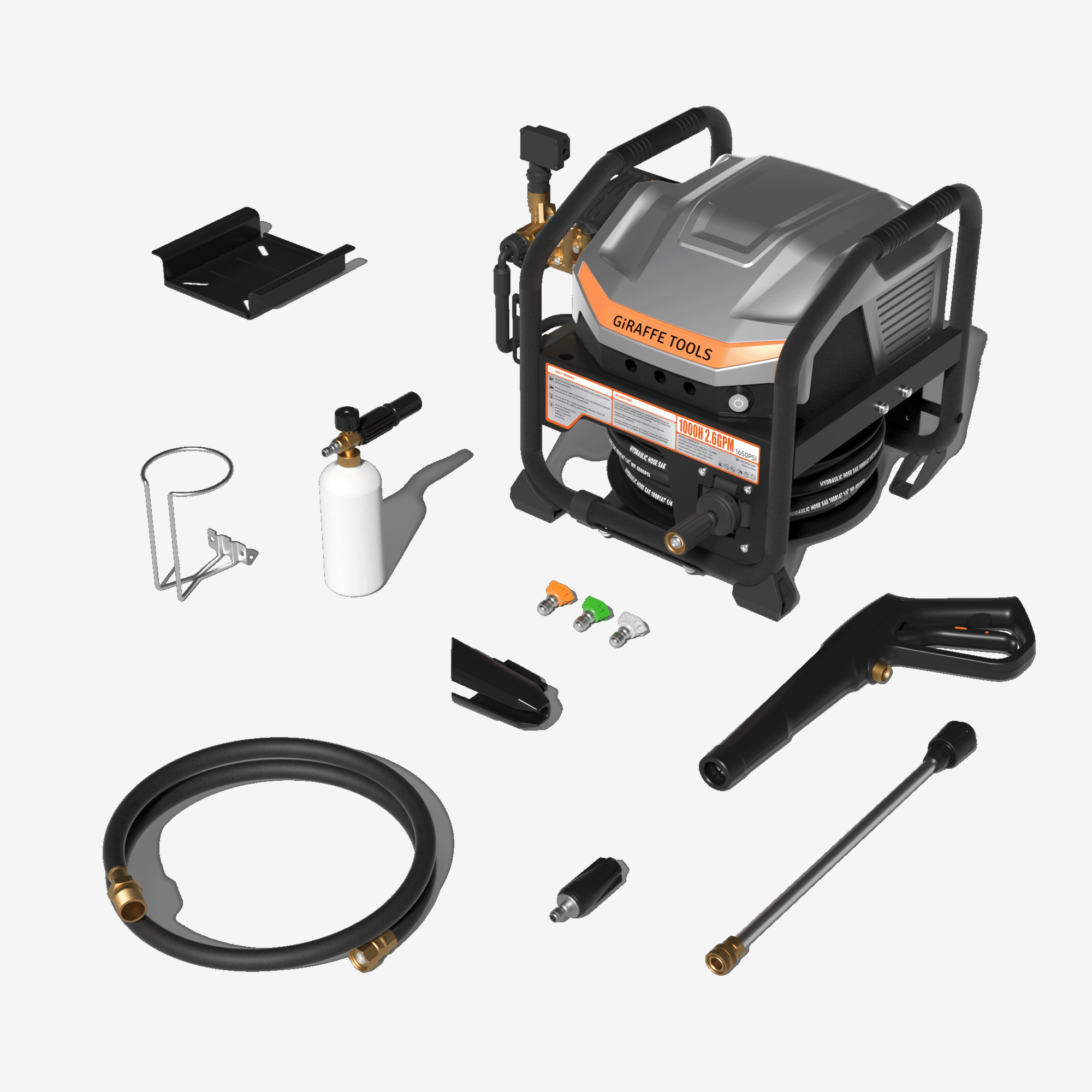 Including: 6ft lead-in hose, 1L fam cannon, high-pressure gun, spay tips, turbo nozzle, 50ft replaceable hose, wall fixed base, etc.