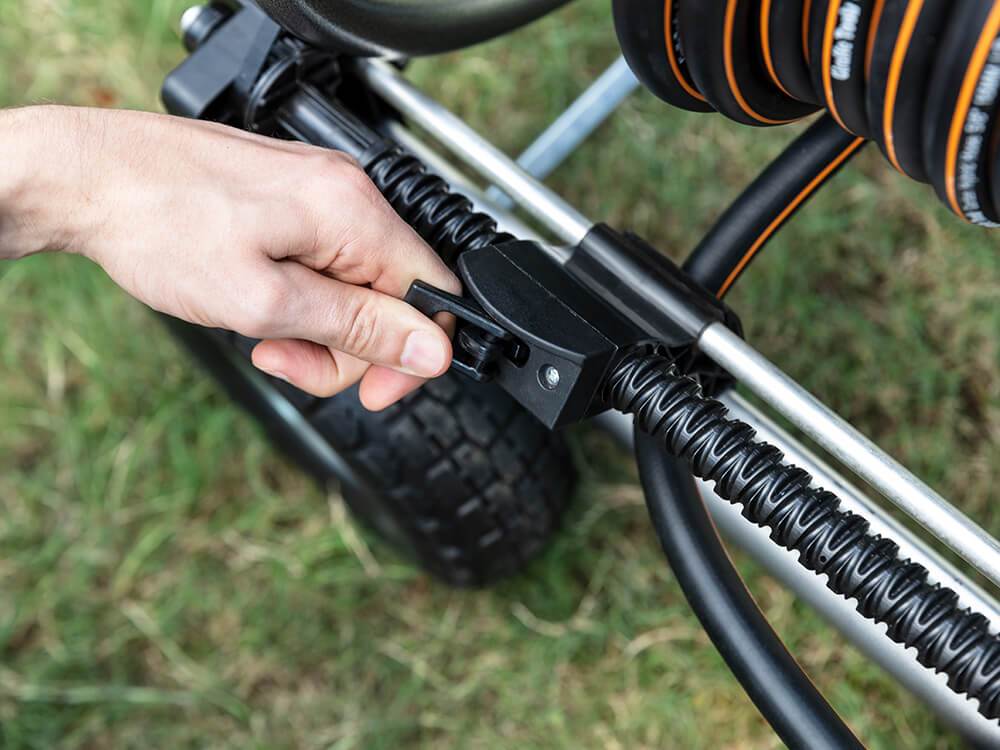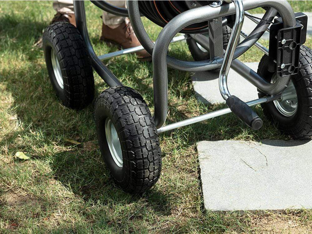 Four never-deflated tires to ensure mobility in the garden while taking into account the stability of pulling the hose