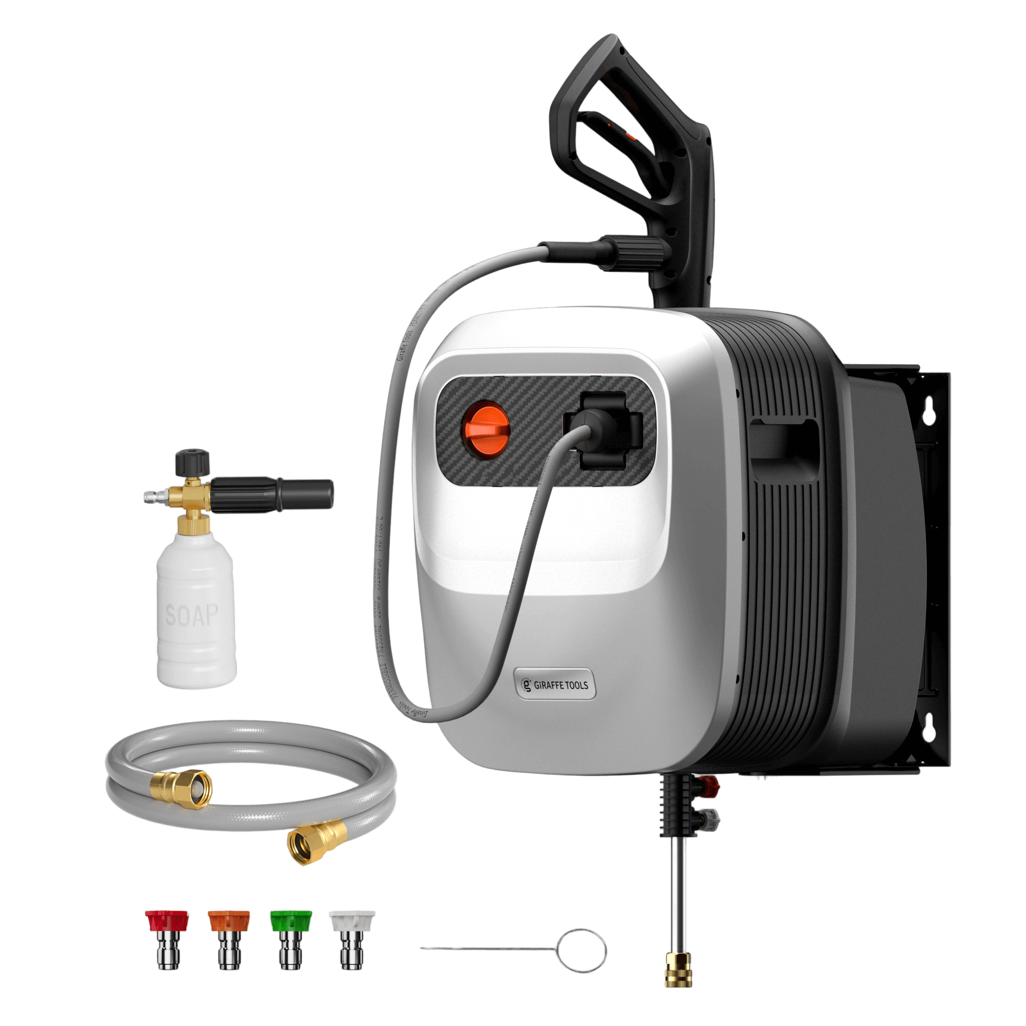 - Wall-Mounted, Organized: Save space with a wall-mounted design that stores hose, spray gun, and nozzles.