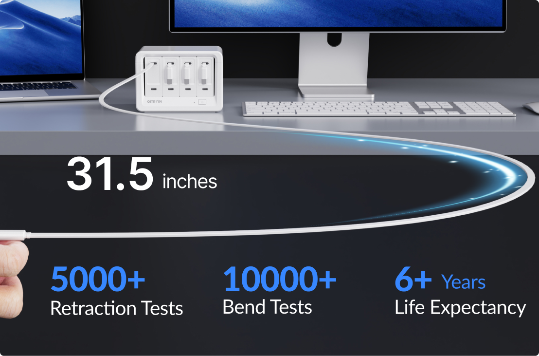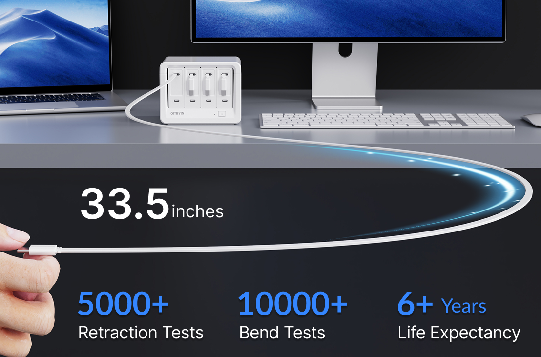 - Compact Design, Seamless Use: Ultra-compact and retractable design for easy storage, keeping your workspace clean and organized. Enjoy a simplified charging experience without the hassle of constantly plugging and unplugging devices.