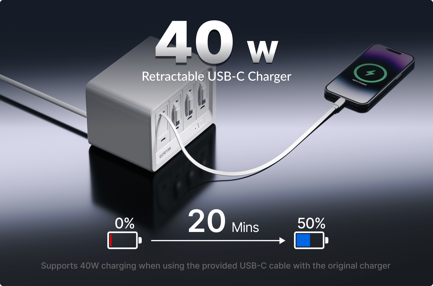 - Instant Power, Easy Organization: The 40W retractable charger offers fast, efficient charging with a 31.5-inch flat cable and USB-C ports, delivering up to 50% charge in 20 minutes. Its advanced GaN technology ensures safety with multiple protections, while the slim 1.1-inch design fits seamlessly into power strips and outlets, saving space and preventing cable clutter.