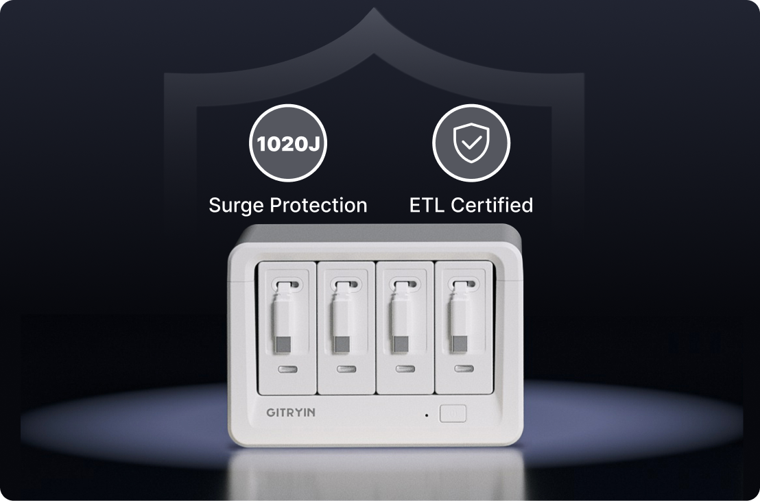 1020J Surge Protection shields your devices from voltage spikes, while ETL-certified safety features prevent overheating—ensuring secure and reliable charging with 8 layers of protection.