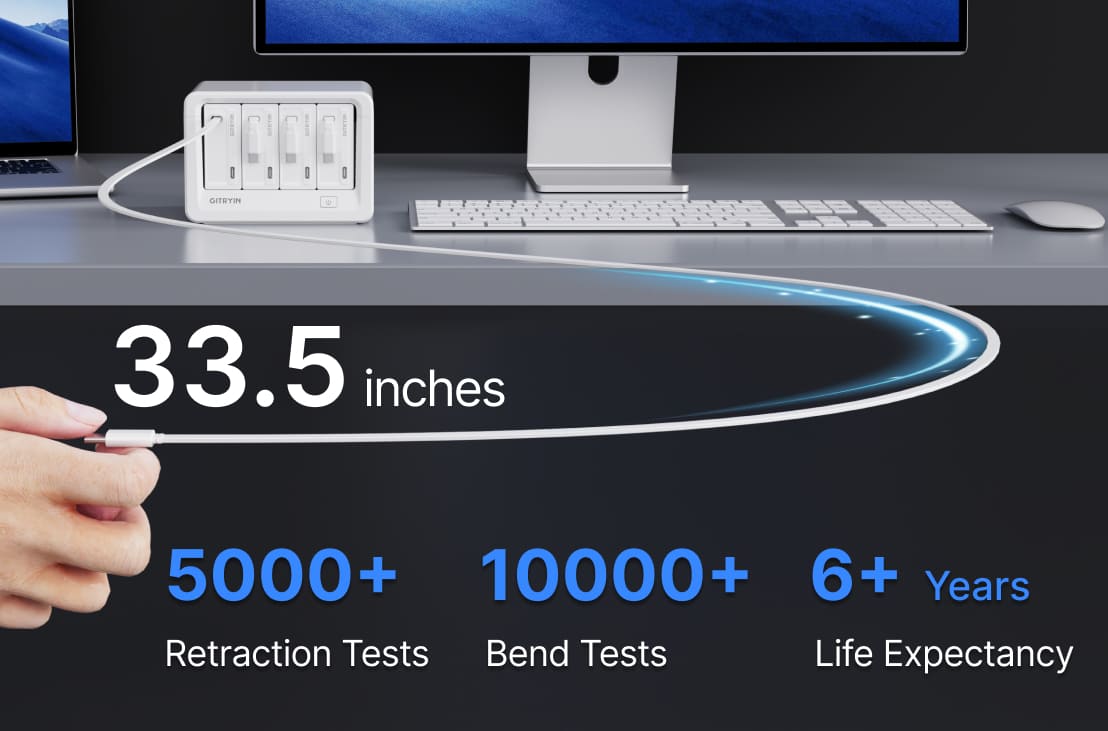 - Compact Design, Seamless Use: Ultra-compact and retractable design for easy storage, keeping your workspace clean and organized. Enjoy a simplified charging experience without the hassle of constantly plugging and unplugging devices.