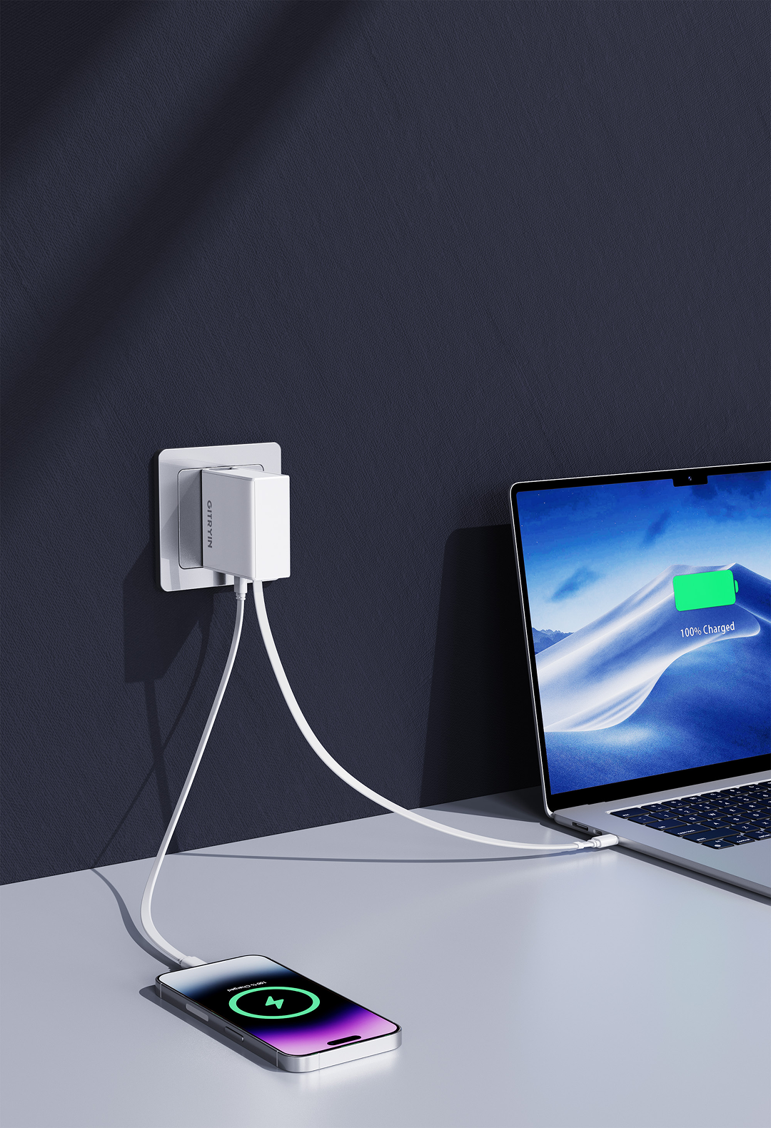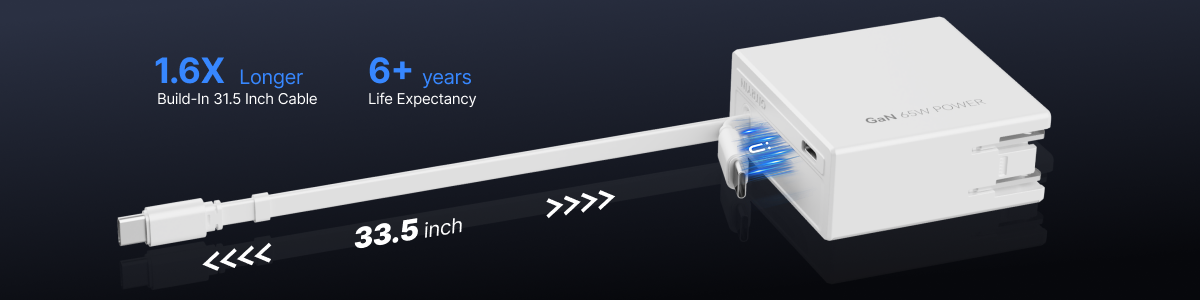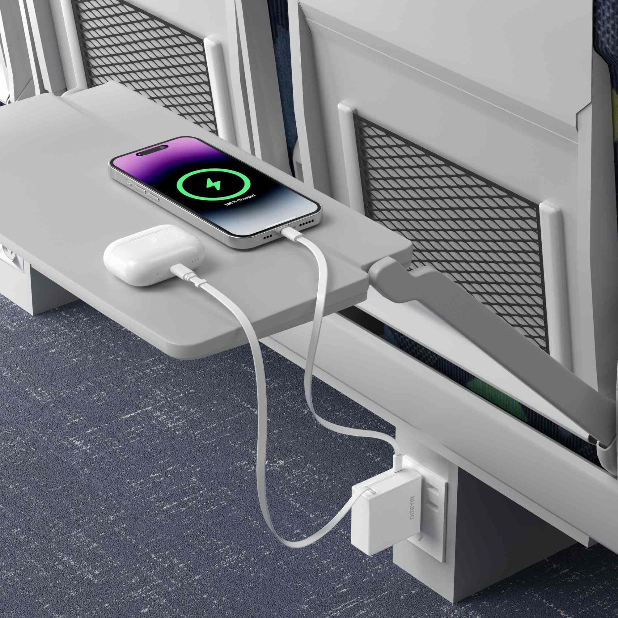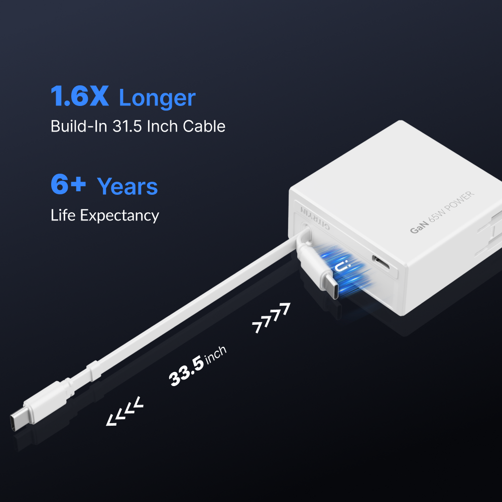 [65W Fast Charging, Supports Two Devices] This charger features a retractable cable and USB-C ports, providing up to 65W of fast charging. It efficiently charges your laptop, phone, or tablet simultaneously, helping you say goodbye to battery anxiety. Whether for work or entertainment, keep your devices powered and ready to go.
