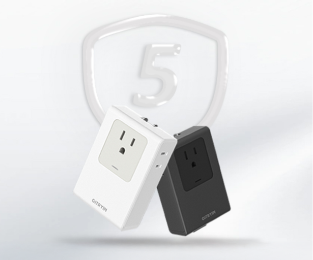 This travel adapter is equipped with overload protection, fire resistance, over-temperature control, overcurrent protection, and short-circuit protection to ensure safe usage.