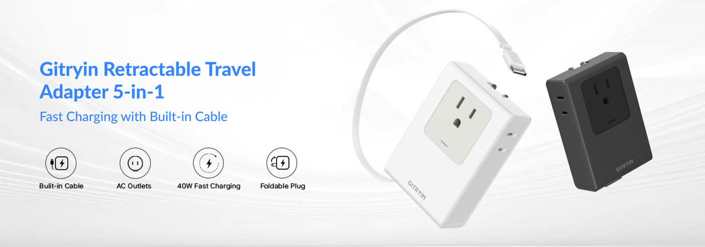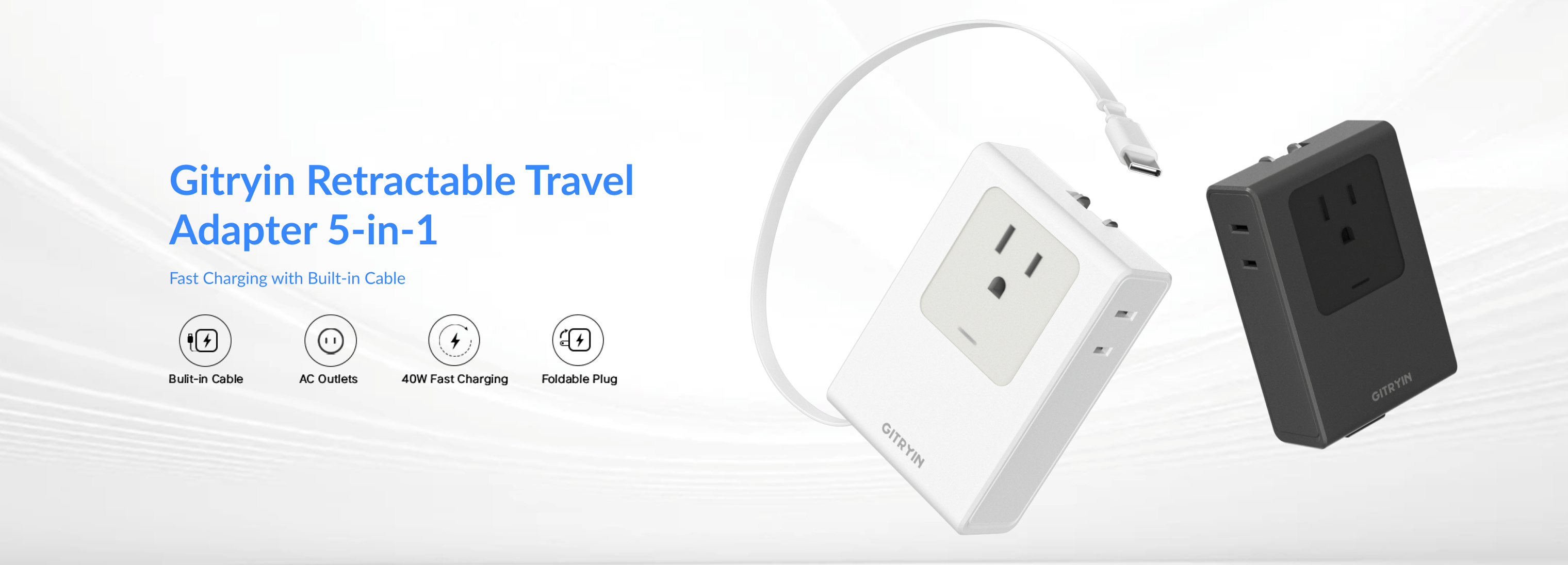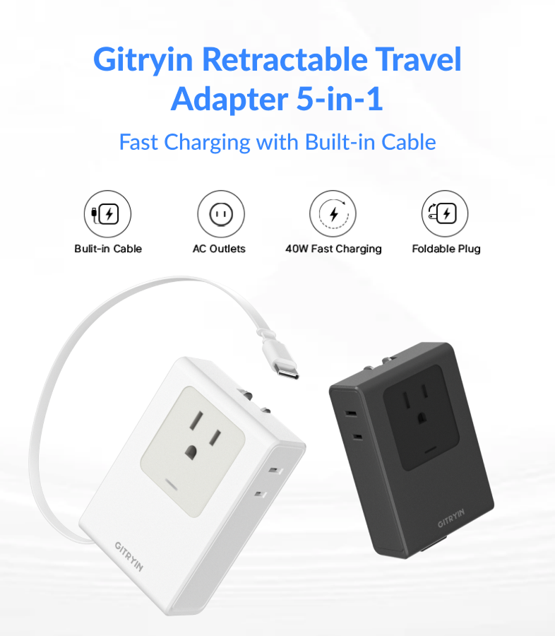 This travel adapter features 3 American outlets (1200W max), 1 USB-C ports, and a 31.5-inch retractable Type-C cable (40W max), allowing you to charge up to 5 devices simultaneously without the need for extra adapters.