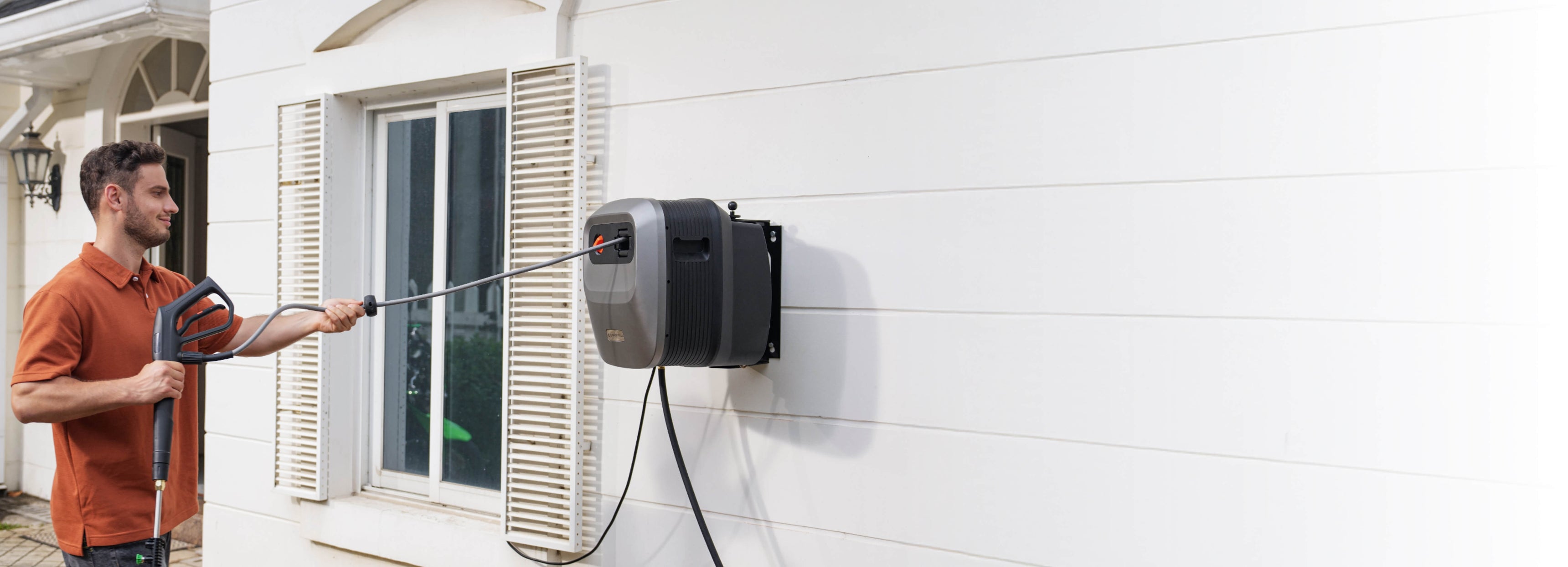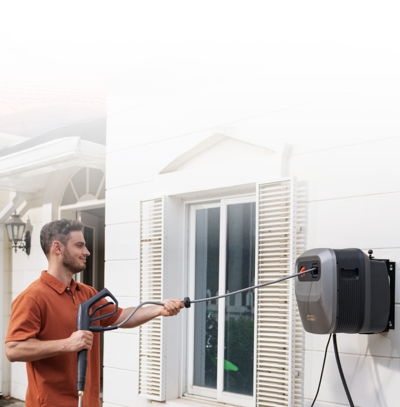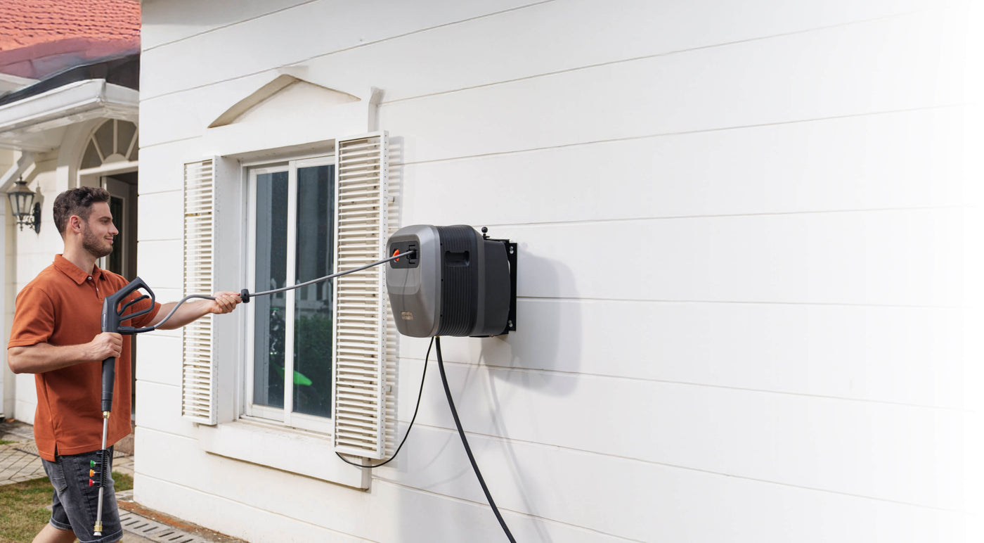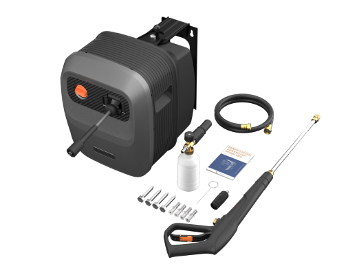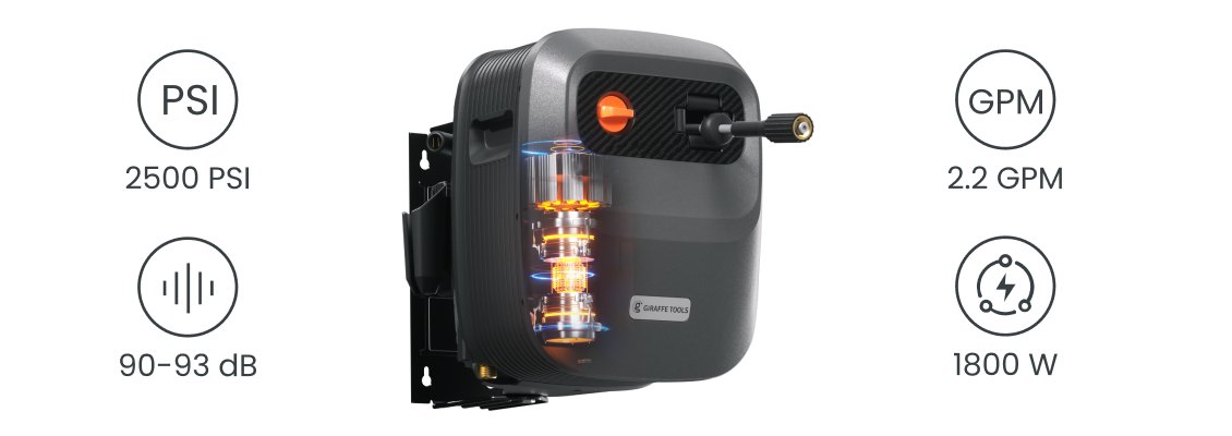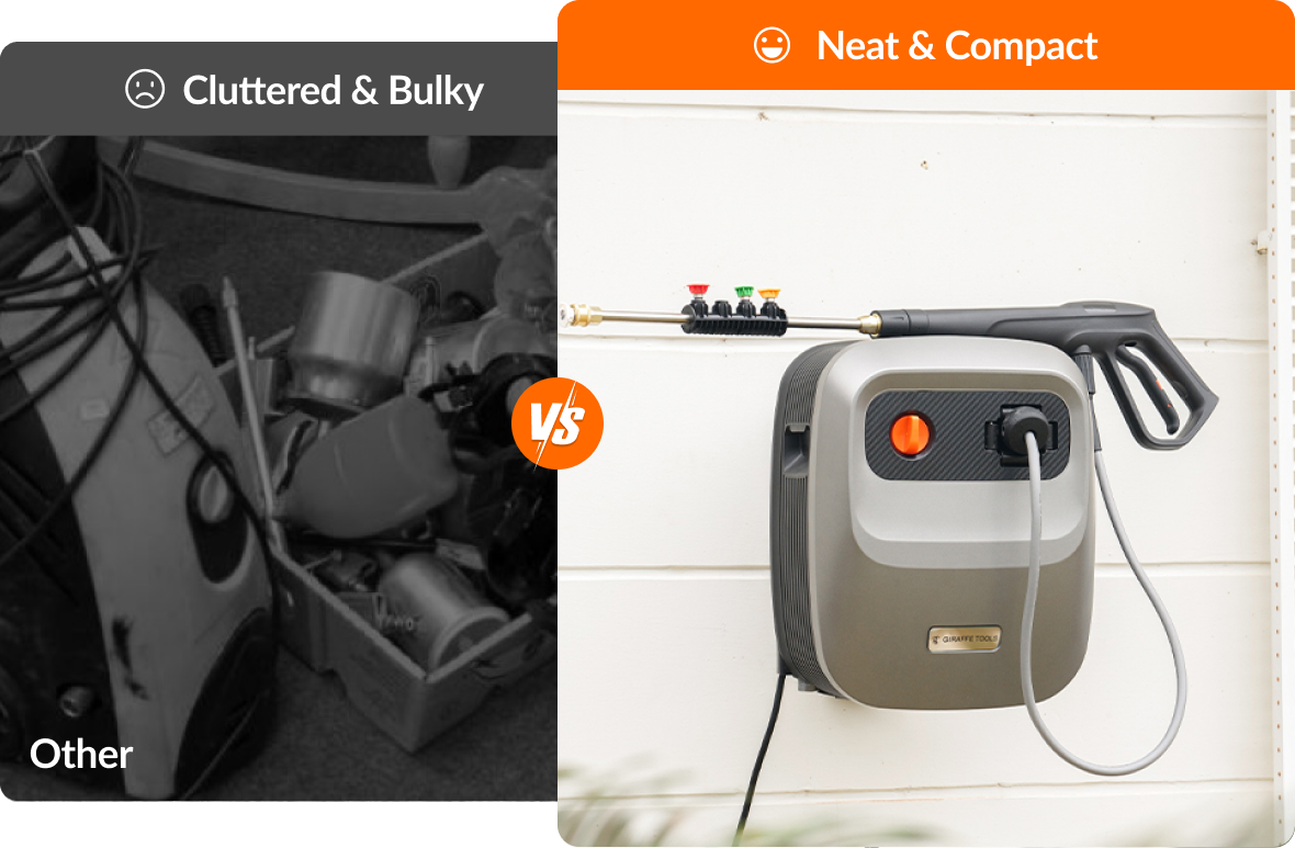 - Wall-Mounted, Fully Organized: Keep your space clean and clutter-free. The wall-mounted design lifts the unit off the ground, while built-in storage compartments hold the hose, spray gun, and nozzles—all in one place. Enjoy the sense of order!