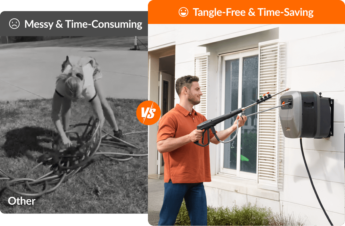 You don't have to bend down and tidy up the messy hose after you finish cleaning. Simply give the hose a light pull and it will automatically arrange itself neatly.
