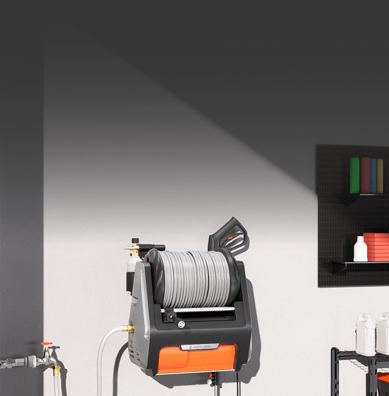 - Wall-Mounted, Fully Organized: Keep your space clean and clutter-free. The wall-mounted design lifts the unit off the ground, while built-in storage compartments hold the hose, spray gun, and nozzles—all in one place. Enjoy the sense of order!