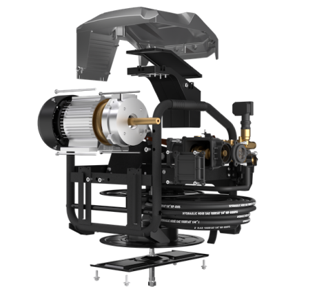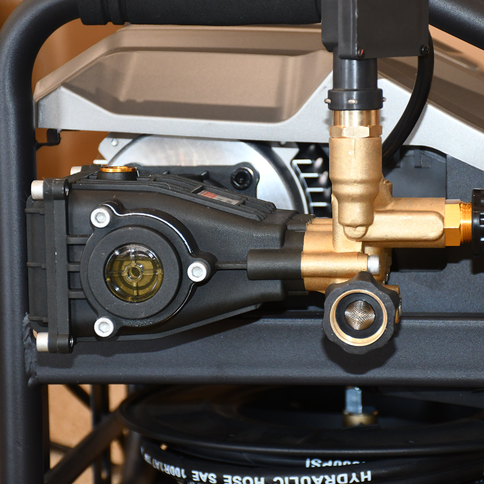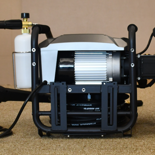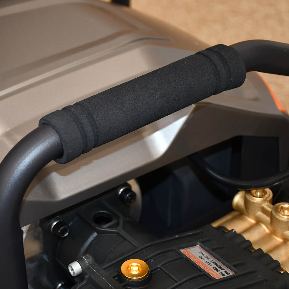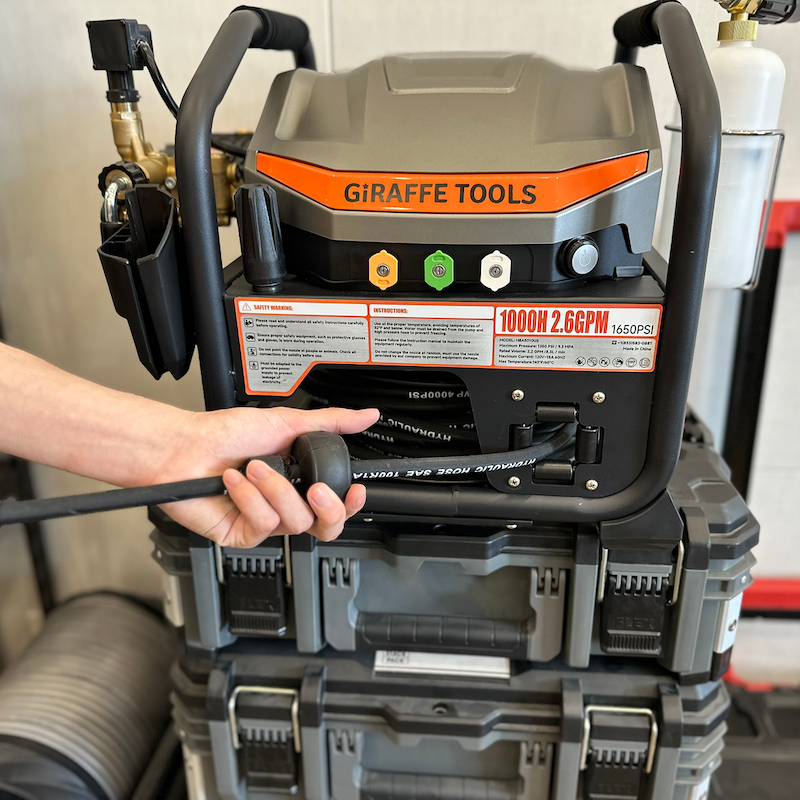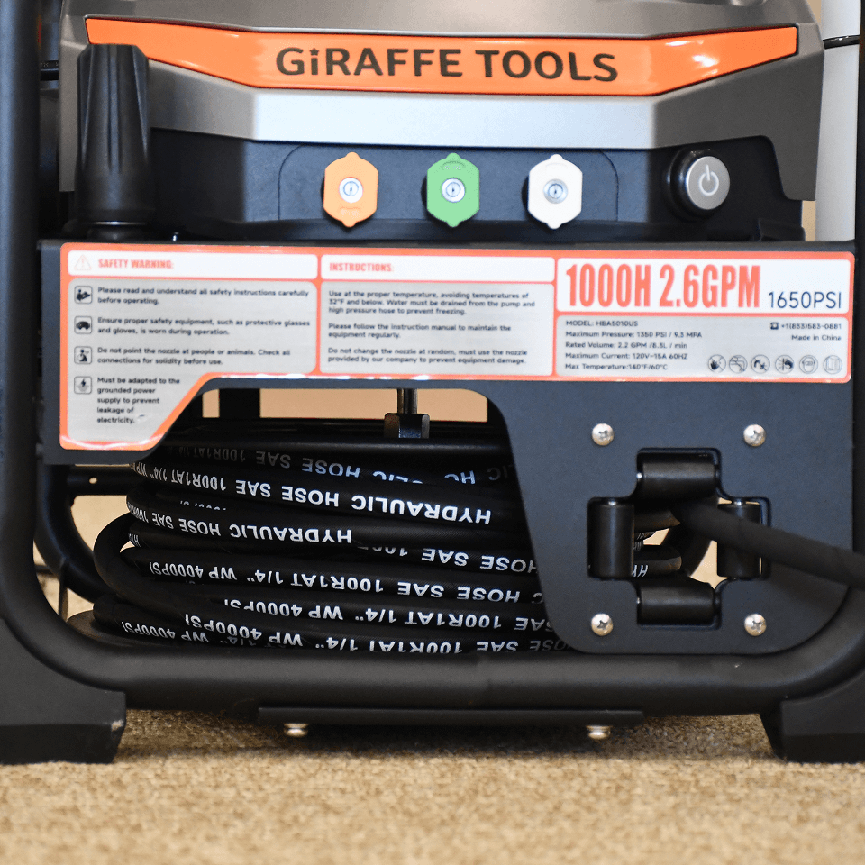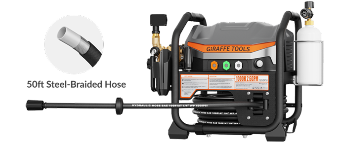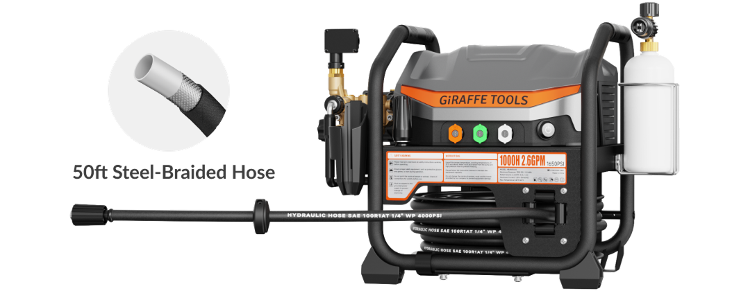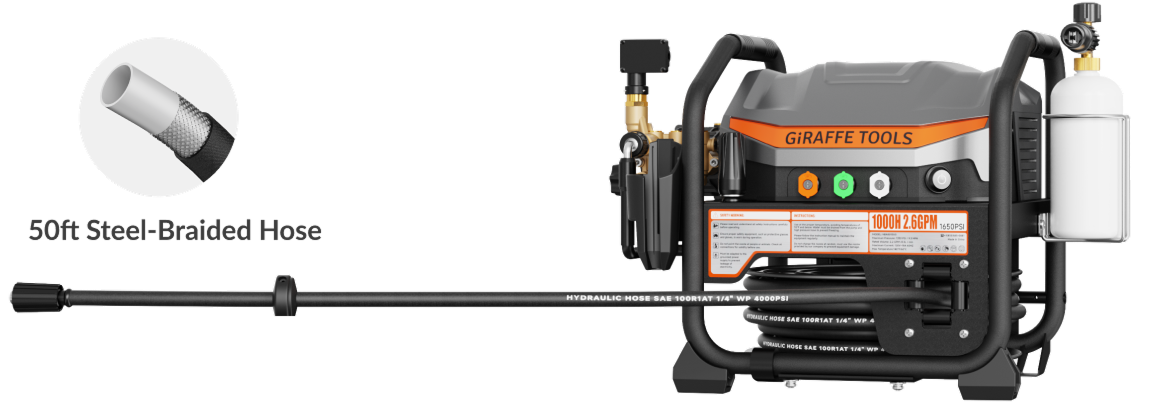 This pressure washer is equipped with a high-pressure hose that can be replaced or upgraded. The standard pressure washer hose length is 50 ft, but longer hoses can be used depending on the cleaning area. For custom setups, consider hose weight and flexibility to ensure smooth operation without straining the unit.