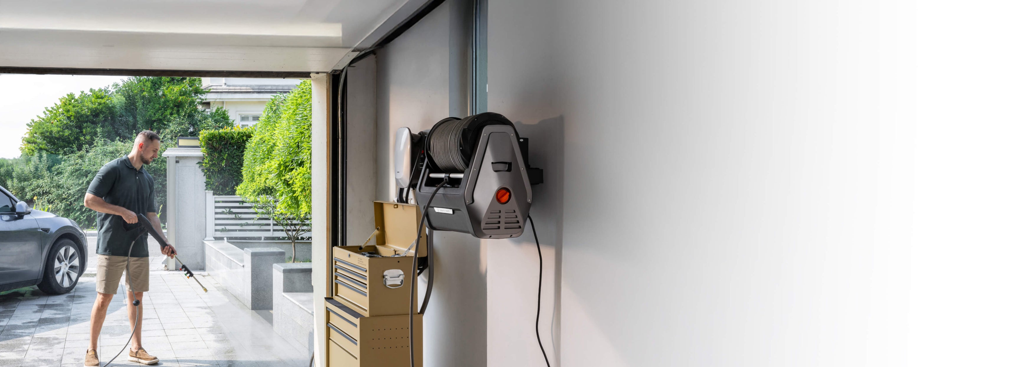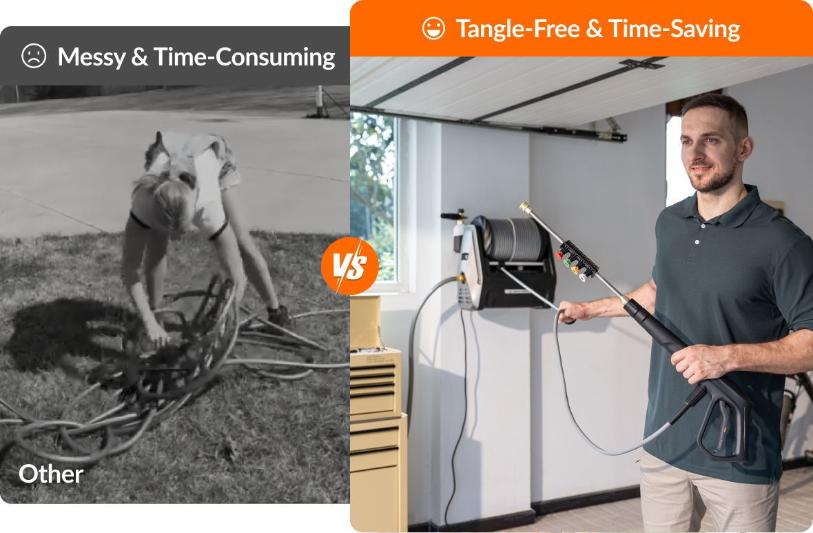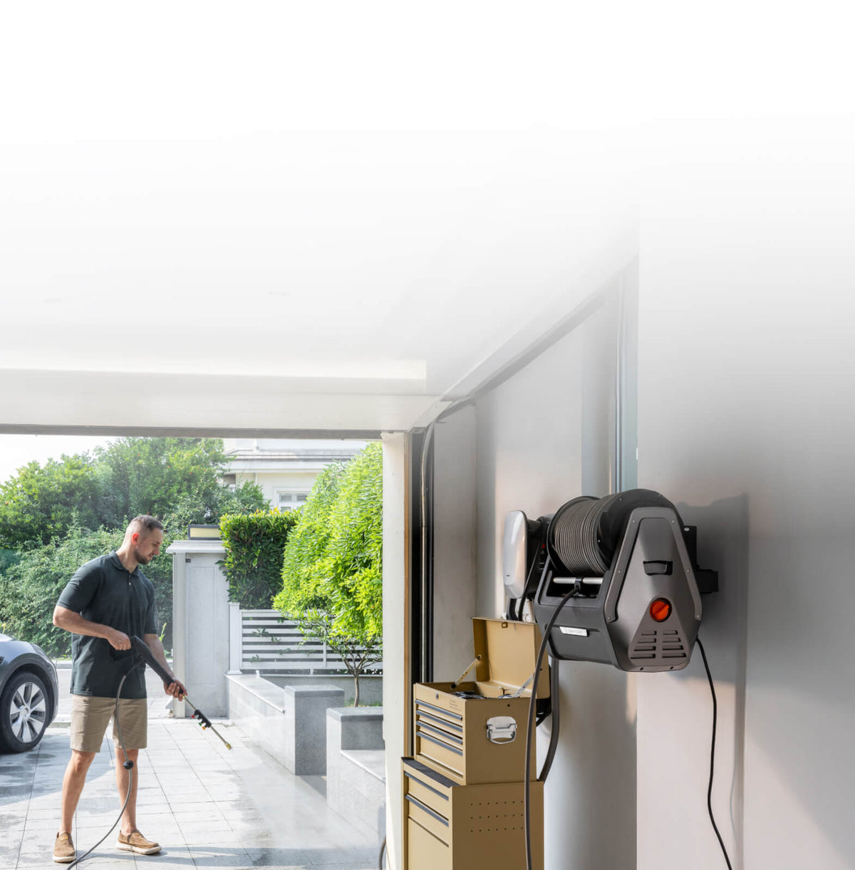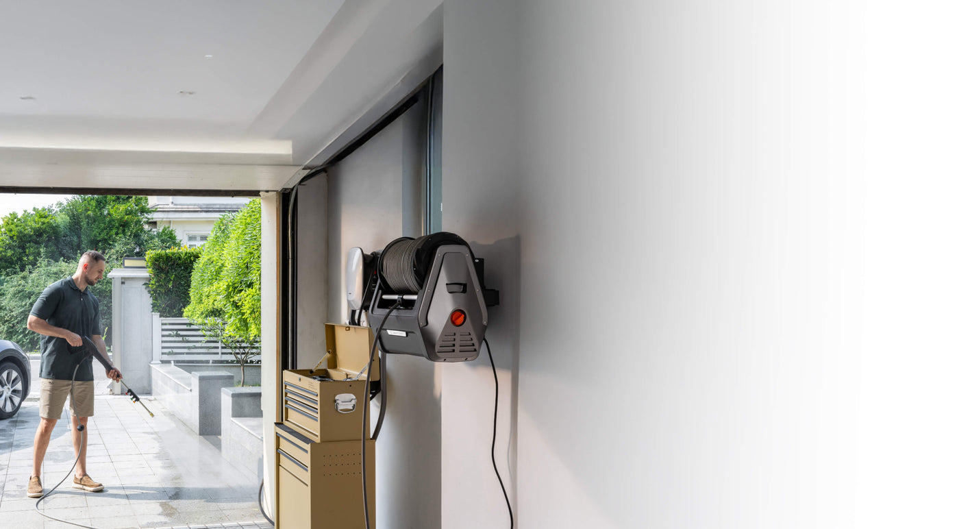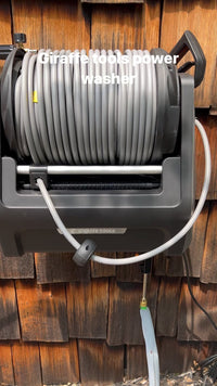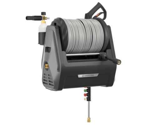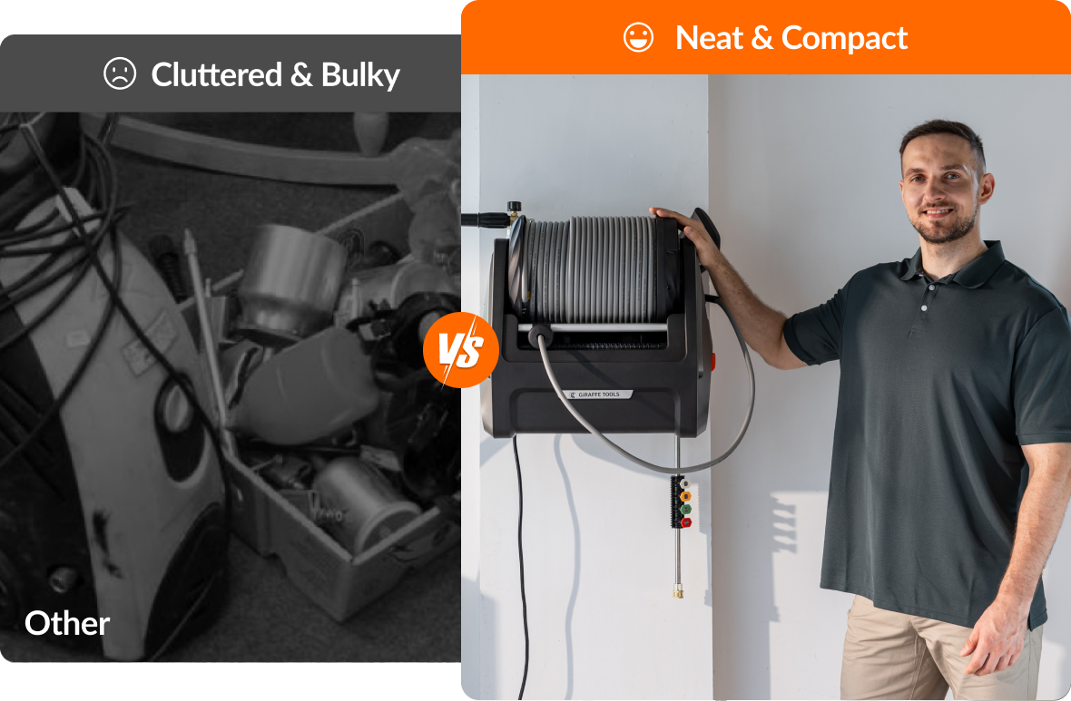 • Wall-Mounted & Organized: Designed to save space, the wall-mounted unit lifts off the ground while built-in compartments neatly store the hose, spray gun, and nozzles—all in one place for a clutter-free setup.