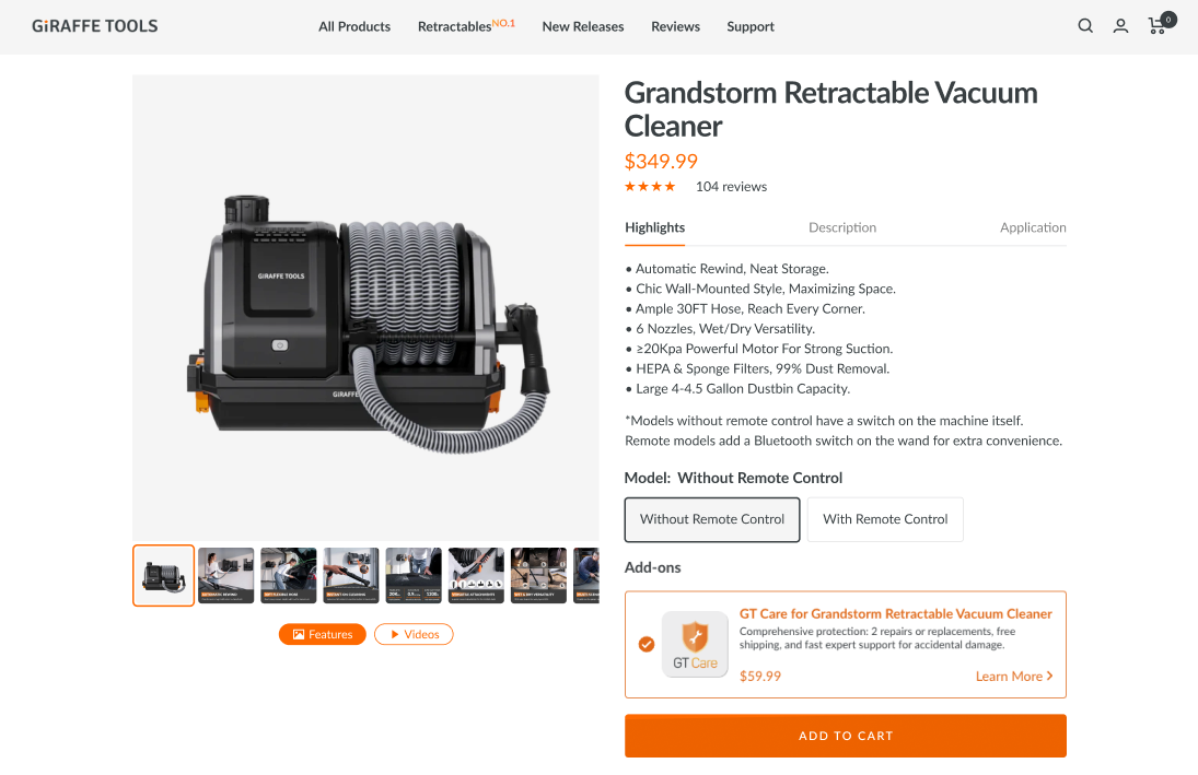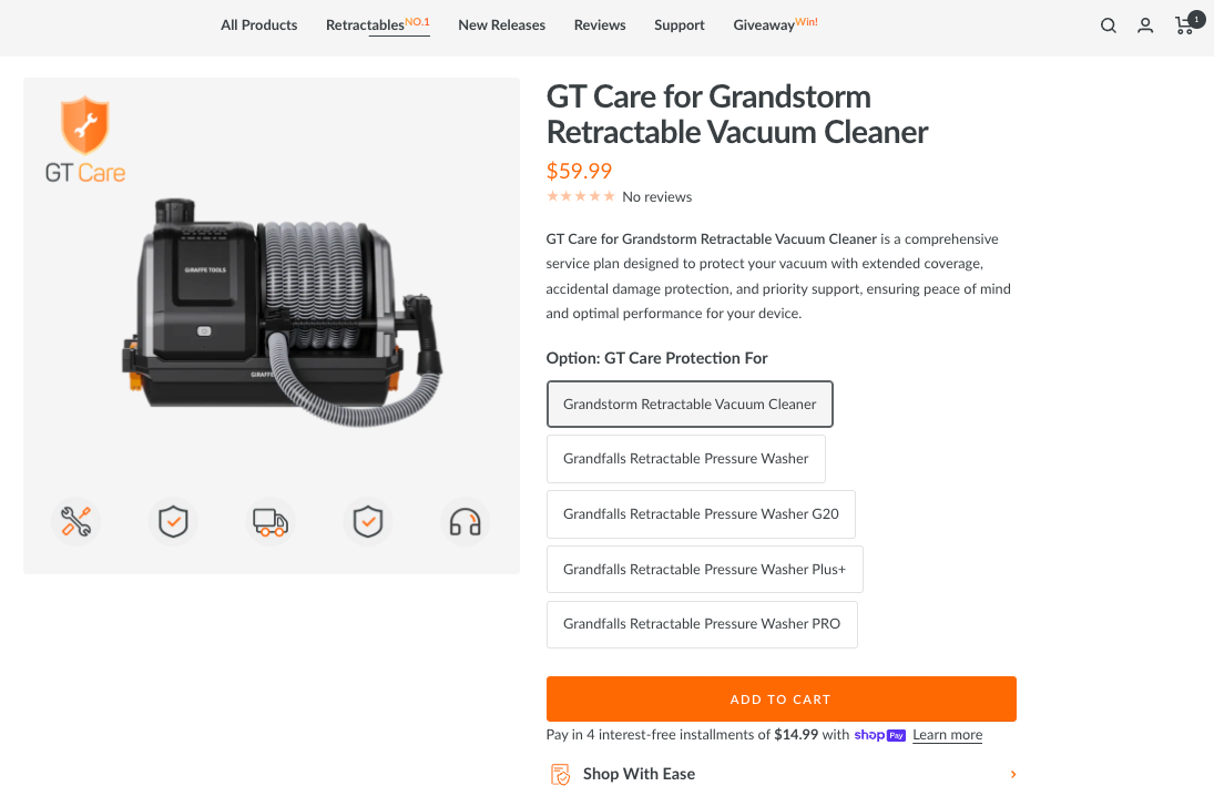 When purchasing pressure washers or vacuum products from our website, you can choose to add the GT Care plan for immediate full protection. GT Care becomes effective on the day the product is delivered.