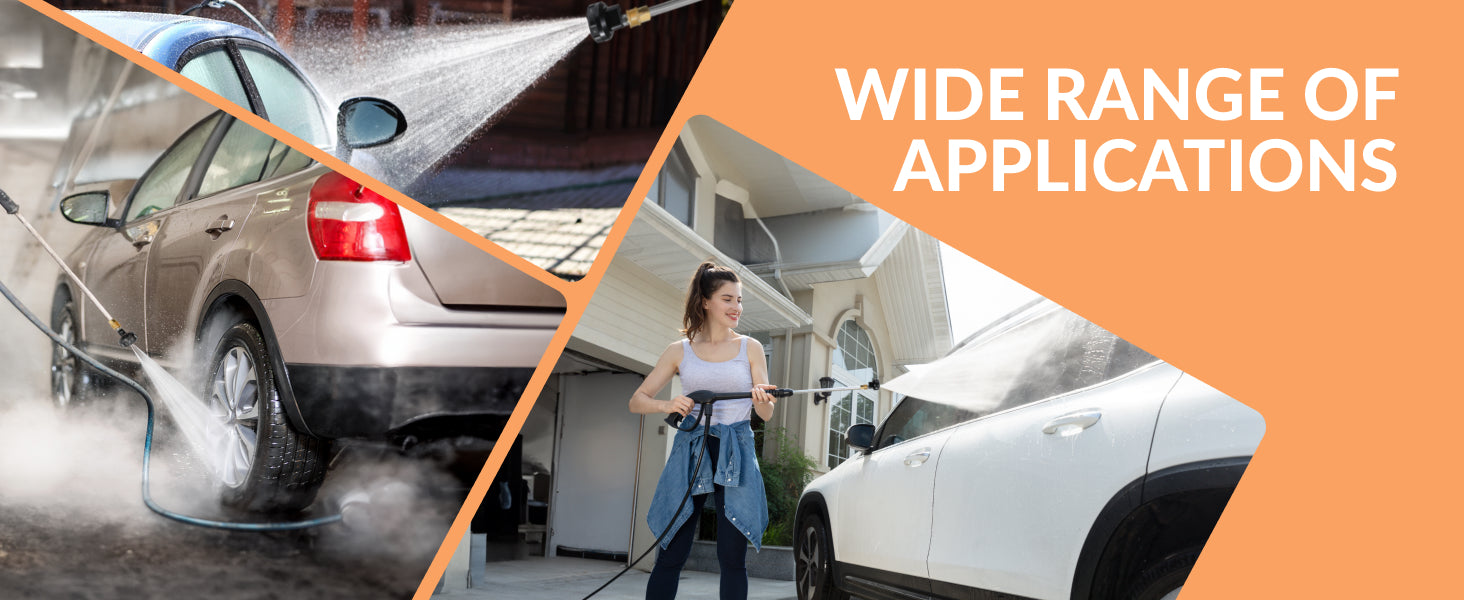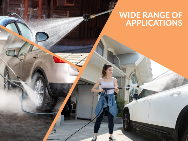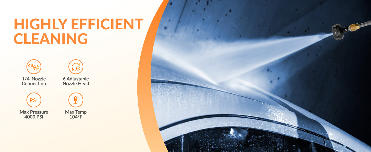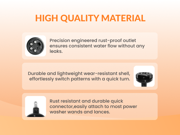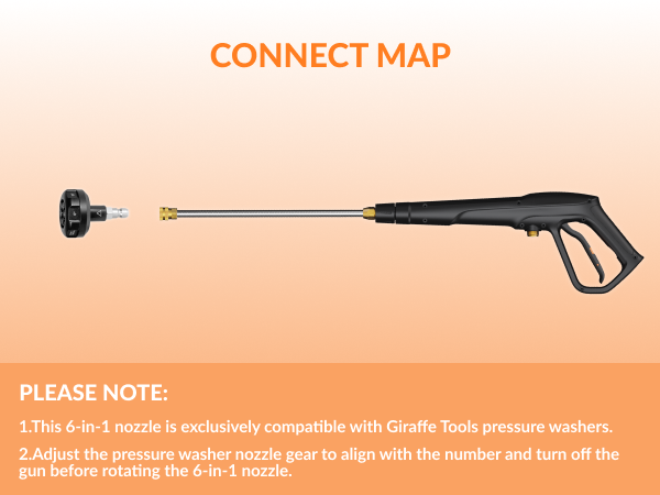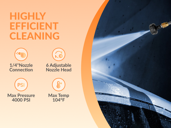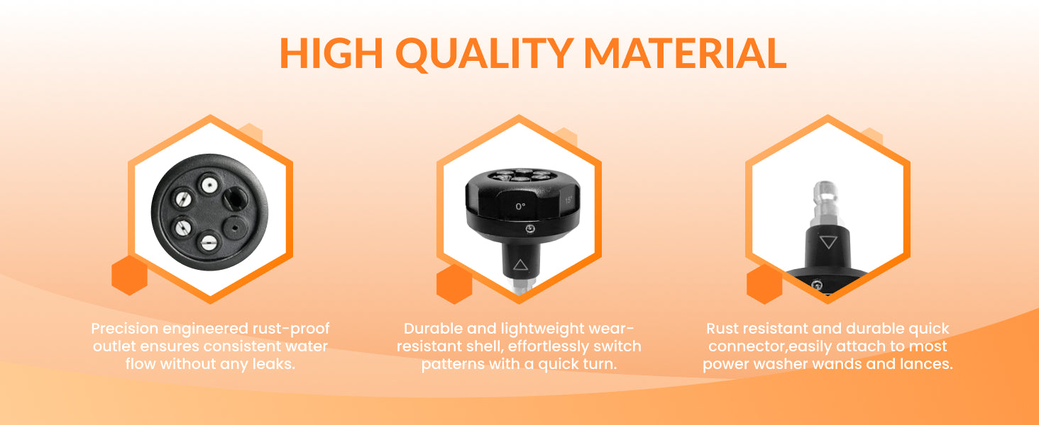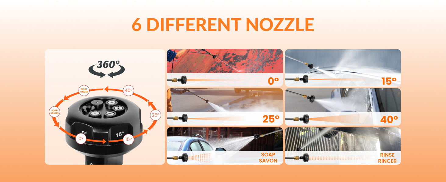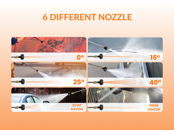 6-IN-1 Efficient & Convenient. Pressure washer spray nozzle tip combines 6 spray patterns into one: 0 degree, 15 degree, 25 degree,40 degree, soap and rinse. This adjustable nozzle tip comes with 1/4" quick plug, which can easily attach to most power washer extension wands and lances. Ideal for washing concrete floors, patios, decks, siding, windows, cars. Also suitable for watering flowers and bathing the pets