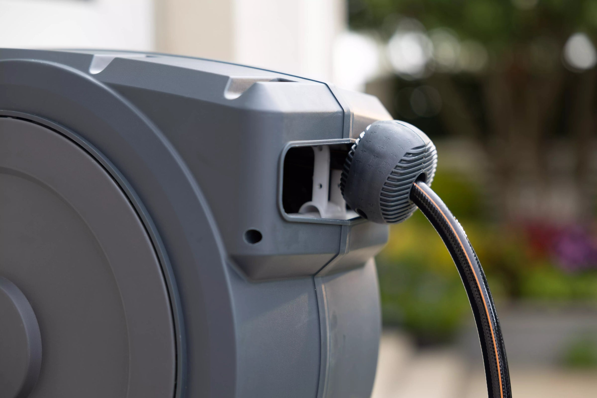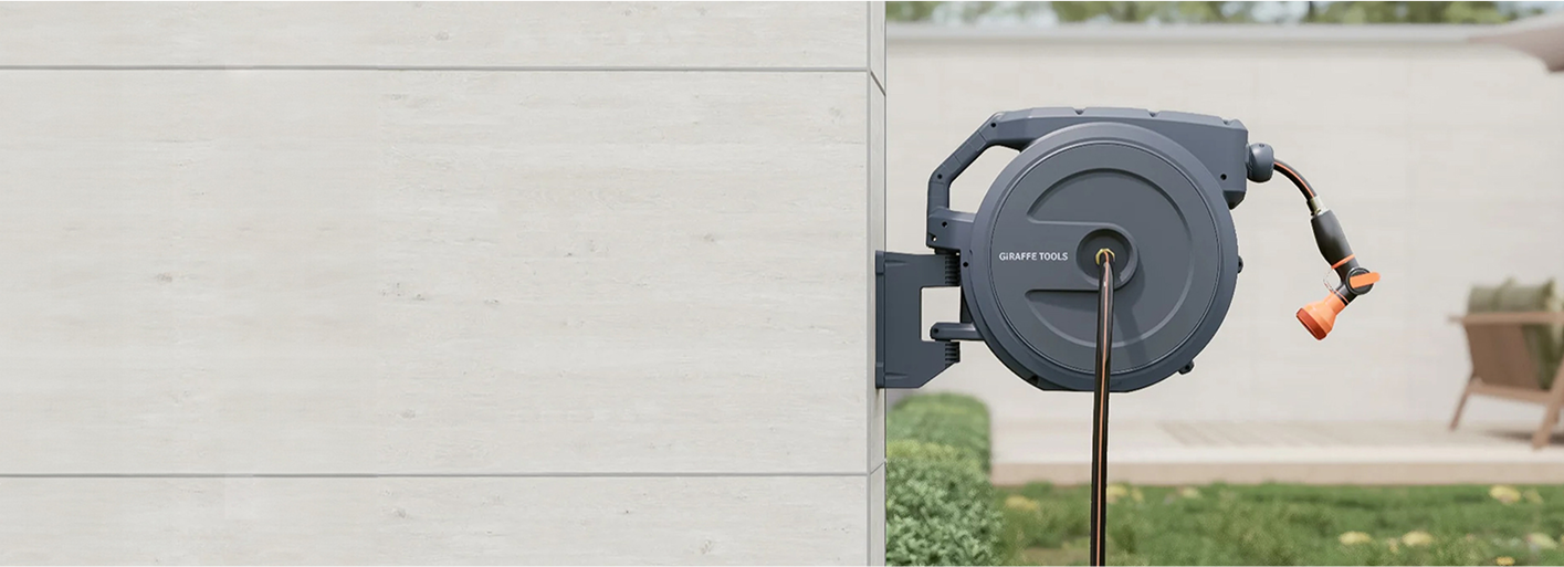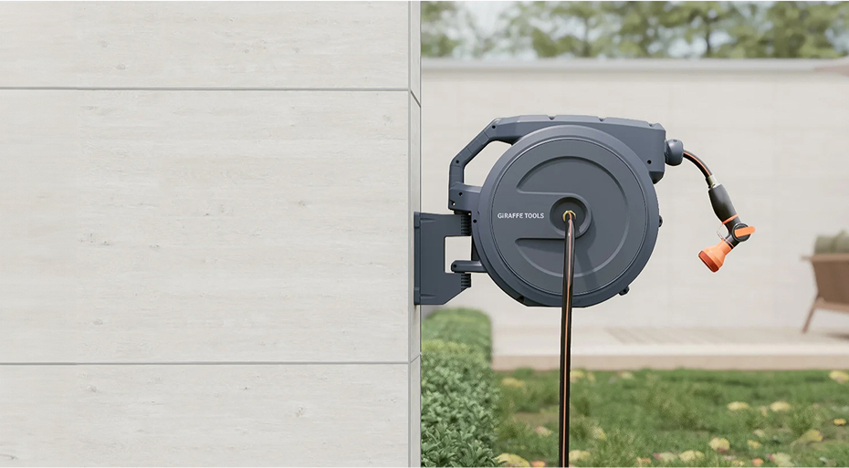 Aesthetic wall-mounted hose reel beautifully complements the scenery of any garden.